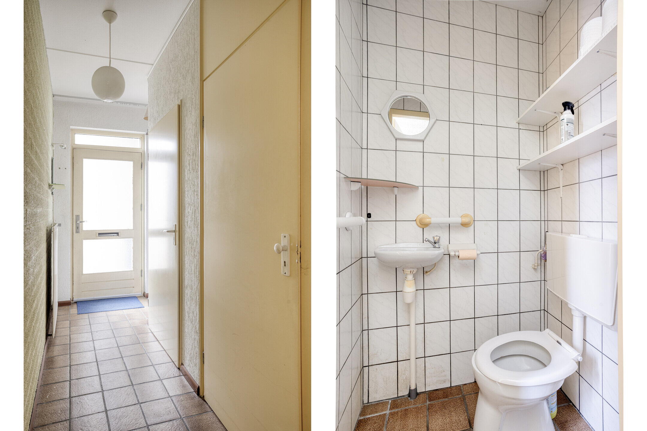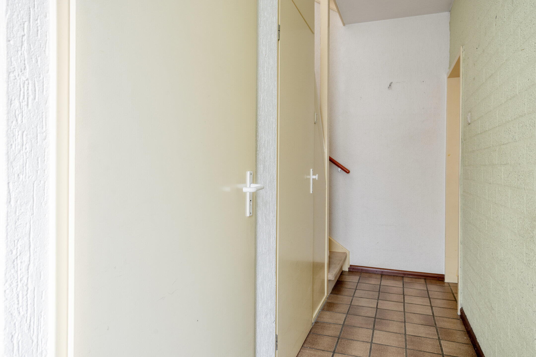 Begane grond: overdekte entree; hal met meterkast, garderobe, trapkast en toilet voorzien een fonteintje.