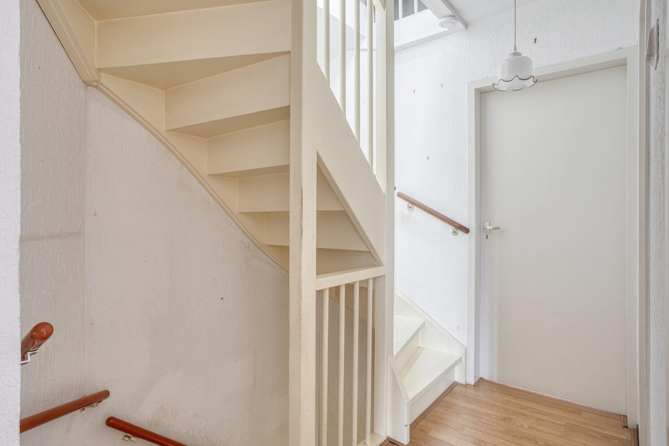 Eerste verdieping: overloop met toegang tot de drie slaapkamers. De slaapkamers aan de achterzijde hebben via een dakraam zicht op de achtertuin. De badkamer is net als de keuken eenvoudig maar functioneel en beschikt over een douche, wastafelmeubel en tweede toilet.